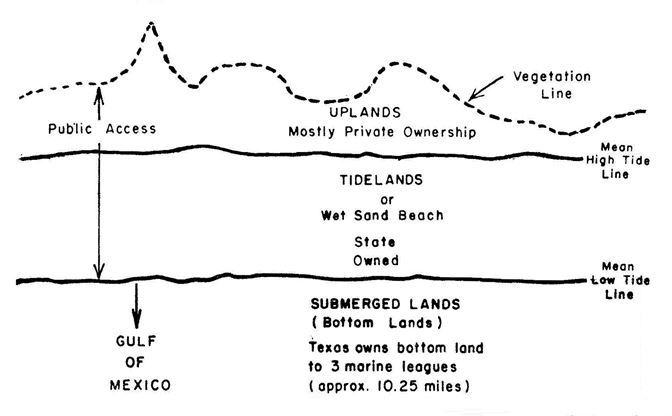 Introduction The newsletter section of this web site contains 40 years of Houston Canoe Club newsletters. Amidst those many publications are buried a lot of gems of information and wisdom, that are still just as valid today as when they first appeared. The following article from 30-years ago is one of those gems. This was originally a six-part article, but instead of making everyone wait six months to read it all, I'm going to combine two parts per month, so that you'll get it over three months instead. You can read the previous parts I and II here, and parts III and IV here. Part V of VI Lakes The determination of the navigability of a lake is somewhat different from the tests used for rivers and streams. Here the test is whether the Lake is navigable "in fact".* Texas court cases applying the navigability "in fact" test have resulted in confusing and opposite results. In 1917, Welden vs. State, a lake three and a half miles long and two miles wide with an average depth of four feet was found to be navigable. The court noted that "It is a reasonable rule that lakes large enough to be useful to the public for boating and fishing should be held to be public and not private property." However, in 1953, Taylor Fishing Club vs. Hammett, the court found a lake one and a half miles long and 700 feet wide with an average depth of 15 feet was not navigable. The court stated, "...The lake is useful for fishing and as a general pleasure resort, but it is generally held that a lake that is chiefly valuable for fishing and pleasure boats of small size, is not navigable." You go figure...! The results of these two cases are so confusing that, in our opinion, the navigability of many Texas lakes without a navigable stream inlet or outlet will have to be decided on a case-by-case basis. * Lakes identified as navigable "in fact" on the basis of whether they are able to sustain commerce. Simply, has the lake served as a highway for commerce? Coastal Waters Now let's talk about Gulf Coast waters of Texas. Texas' coast extends nearly 600 miles along the Gulf of Mexico. The shoreline continues 2500 miles along islands, peninsulas, marshes, bays and estuaries. Thus, the coastal area has great recreational value. We may divide Texas Coastal lands into three areas. 1) Uplands 2) Tidelands 3) Submerged lands. UPLANDS This generally refers to the area of land above the influence of the mean high tide. Most of the state's coastal uplands are privately owned. The original source of title to these lands may be either by a Spanish or Mexican land grant or by conveyance from the Republic or State of Texas. TIDELANDS Land generally located below the mean high tide and above the mean low tide is referred to as tidelands. It is the area of wet sand subject to "the ebb and flow" of the tides. Except for some tidelands granted to local governments or private parties, the state owns the land lying below the mean high tide and above the mean low tide. SUBMERGED LANDS In 1836 the Republic of Texas established seaward boundary at three marine leagues (roughly 10.25 miles) from the Gulf of Mexico's shore. When the Republic was admitted to statehood in 1845, the U.S. Congress accepted the Texas Constitution and laws, including the three-league boundary. In 1953, Congress passed the Federal Submerged Land Act confirming Texas' title to the bottomland of the Gulf out to the three marine-league limit. The next article will discuss the public's right to use the Gulf waters, and the Open Beaches Act of 1959. Part VI of VI GULF WATERS - OPEN BEACHES Texas was a leader in protecting the use of its seashore and public access to it, way before many other states recognized the values of beaches. In 1959 the legislature passed the Texas Open Beaches Act, verbalizing the state policy of guaranteeing recreational usage of its beaches and tidal waters. The Act recognized state ownership of tidelands and the public use of these wet sand beaches, but went one step further and extended a right of public access into the upland areas of the beaches. Section 61.011 of the Natural Resources Code declares the public policy of Texas to be: that the public shall have the free and unrestricted right of ingress and egress from state owned beaches bordering on the seaward shore of the Gulf of Mexico or, if the public has acquired a right of use or easement to, or over an area - the public shall have a right of ingress and egress to a larger area extending from the mean low tide to the line of vegetation bordering on the Gulf of Mexico. (Figure 1 Rights of public access: Open Beaches Act) Figure 1 shows the public has a right to use the dry sand portion of Texas beaches below the vegetation line, even though this upland area may be privately owned. Another provision states that a private littoral owner's title does not include the right to prevent the public from using the area below the vegetation line for ingress or egress to the sea. There is a prescriptive right of public access to this area. Moreover, the act specifically prohibits private property owners from constructing fences or barriers from the vegetation line to the mean high tide line to prevent the public from using this area. A private landowner may prosecute beach users for trespassing if they cross upland private property to reach a beach covered by this act. However, once a user obtains lawful access to the open beach area, the user may travel freely up and down the beach. The Texas Open Beaches Act does not apply to: 1) beaches on the landward side of islands and bays; 2) remote beaches on islands not accessible by road or ferry; 3) beaches over which no prescriptive right has been established. Short of the above limiting conditions, the Open Beaches Act of 1959 grants the public the rights of ingress and egress over all gulf-side beaches below the vegetation line.
