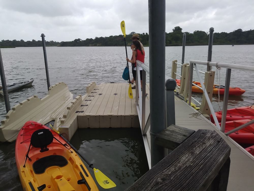 Below is the Armand Bayou Nature Center new dock. Their sit-on-top kayak fleet was using it when I was there, presumably this works also for their canoes and perhaps an access point for the pontoon boat.